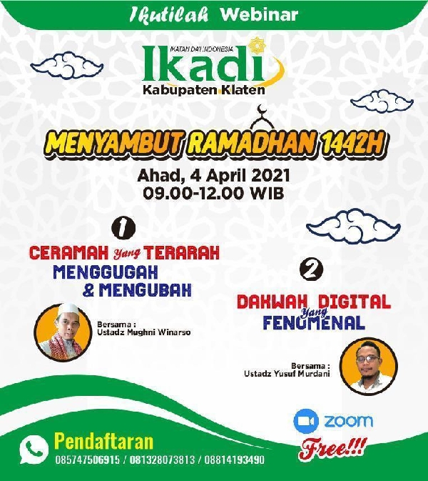 Pelatihan Dai oleh Ikadi Klaten 4 April 2021 mulai jam 09.00 WIB akan dilaksanakan secara webinar dan gratis. Bagi peserta yang mau mengikuti diwajibkan melalui WhatsApp di nomor 08574506915 atau 081328073813 atau 08814193490 untuk mendapatkan link akses. (ino)