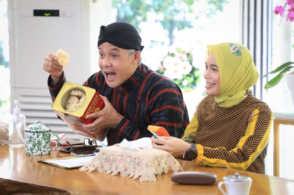 “Tebakanmu salah, iki isine rengginang. Awakmu ki terlalu modern (kamu itu terlalu modern), nek wong lawas mesthi paham kaleng iki isine rengginang, nek ora ya rempeyek (kalau orang lama pasti tahu ini isinya rengginang, atau kalau tidak rempeyek),” jawab Ganjar sambil memakan rengginang itu.