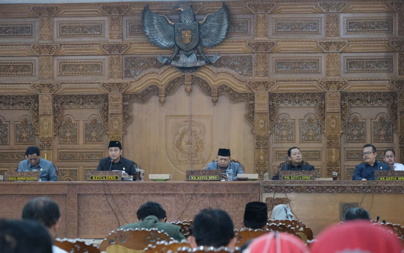 Wakil Bupati Klaten, Yoga Hardaya menyampaikan jawaban Bupati Klaten, Sri Mulyani terhadap dua Rancangan Peraturan Daerah (Raperda) mengenai pengembangan pondok pesantren dan Raperda Pendidikan Pancasila dan Wawasan Kebangsaan. Jawaban atas pandangan umum fraksi-fraksi tersebut disampaikan saat Rapat Paripurna yang dipimpin oleh Ketua DPRD Klaten, Hamenang Wajar Ismoyo, Rabu (08/02/2023) di Ruang Rapat Paripurna.